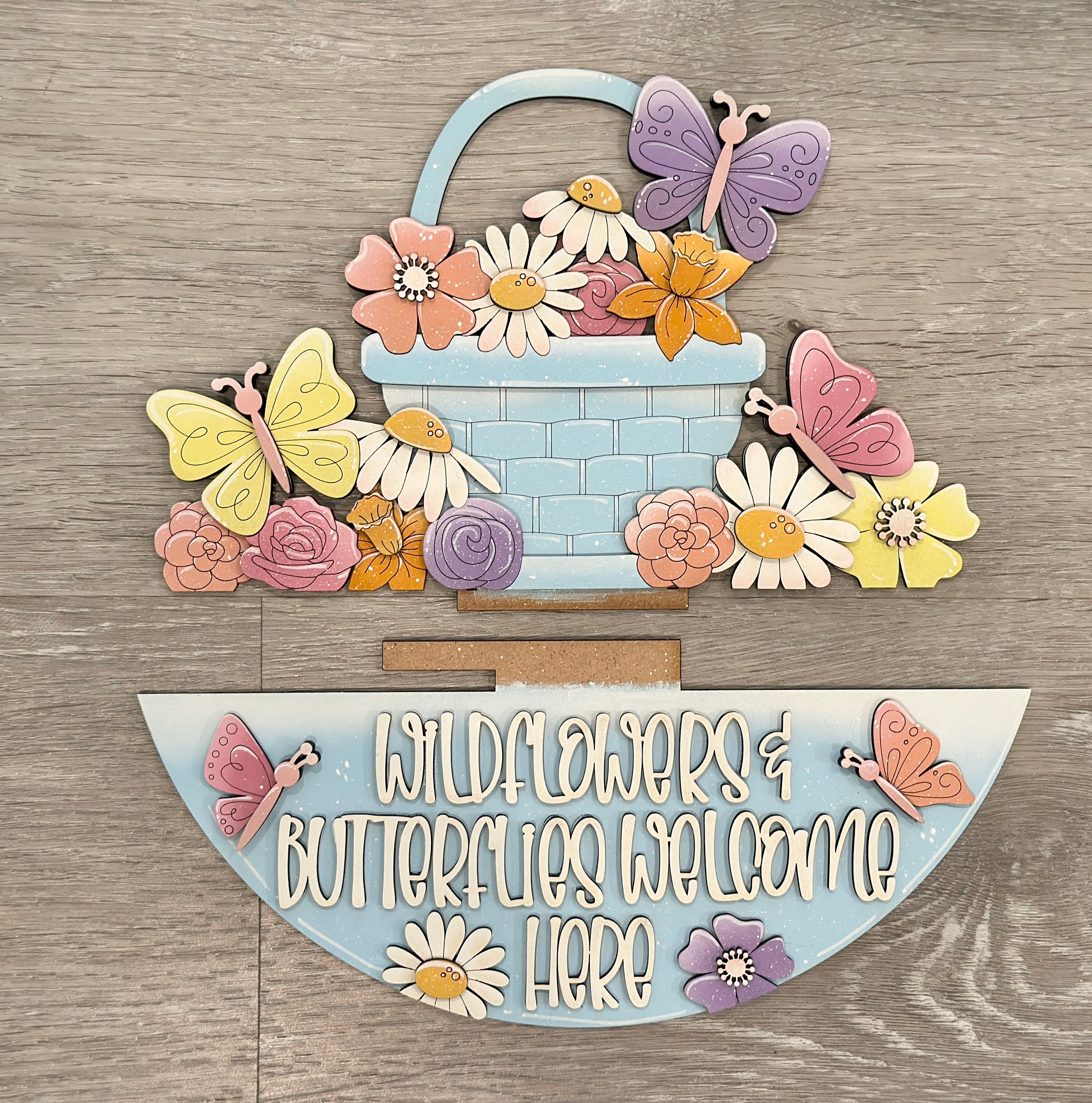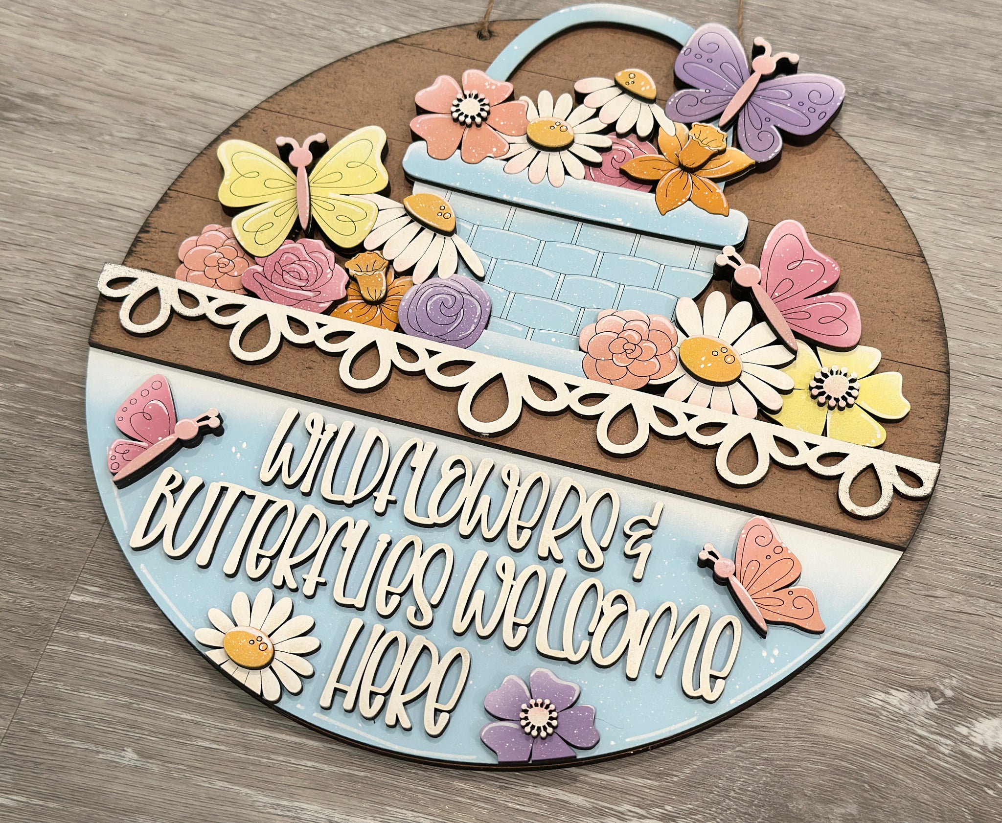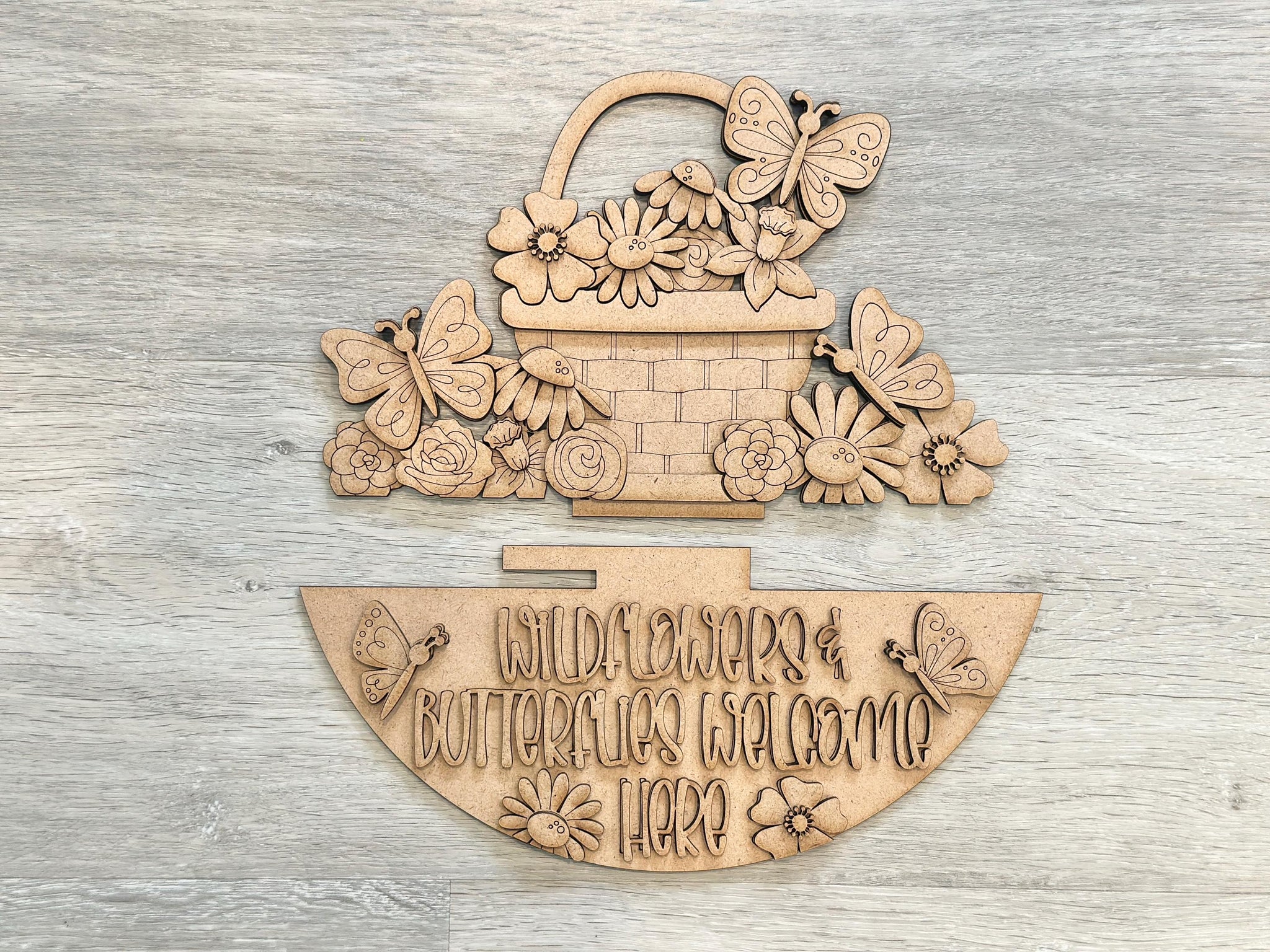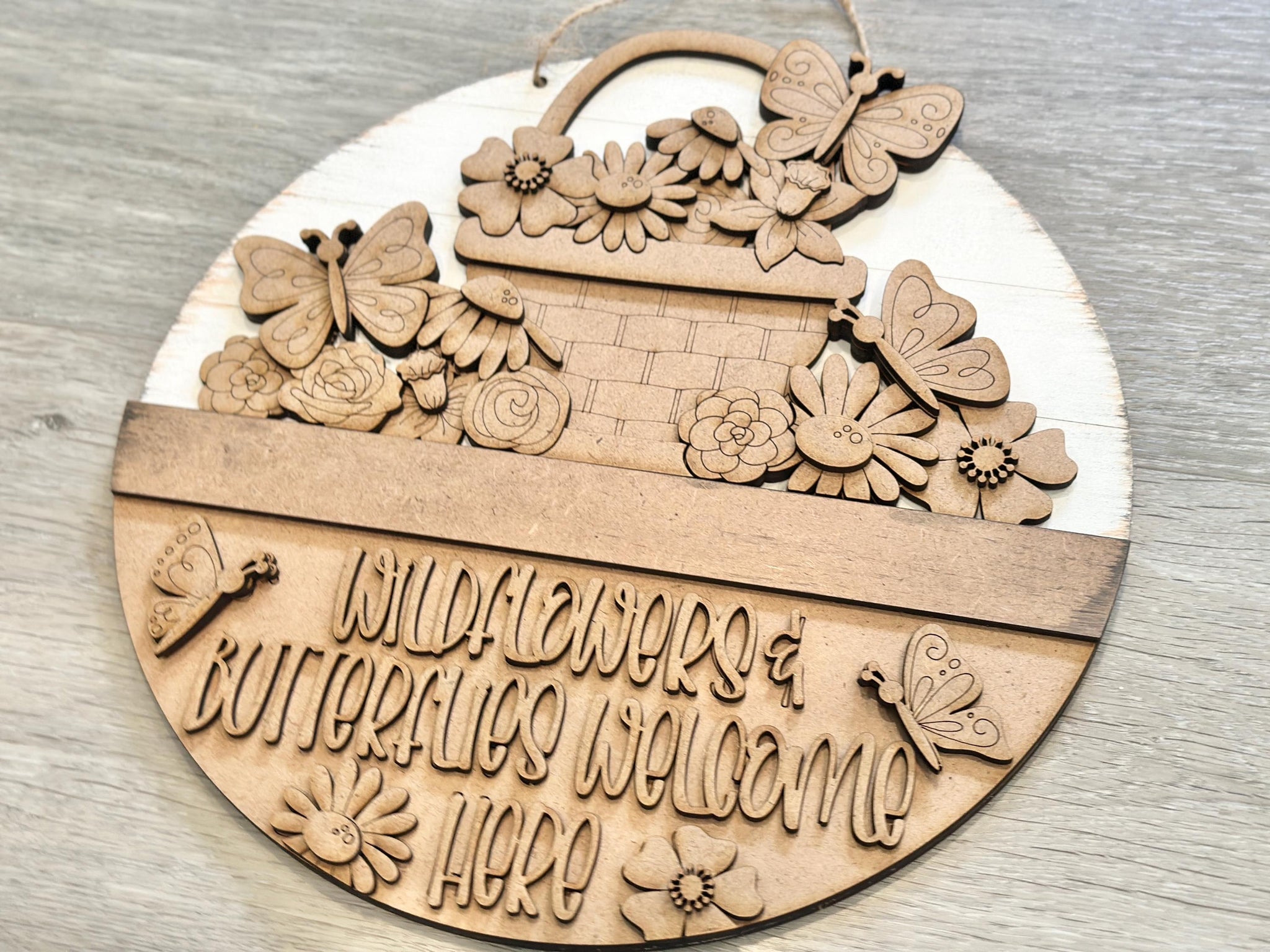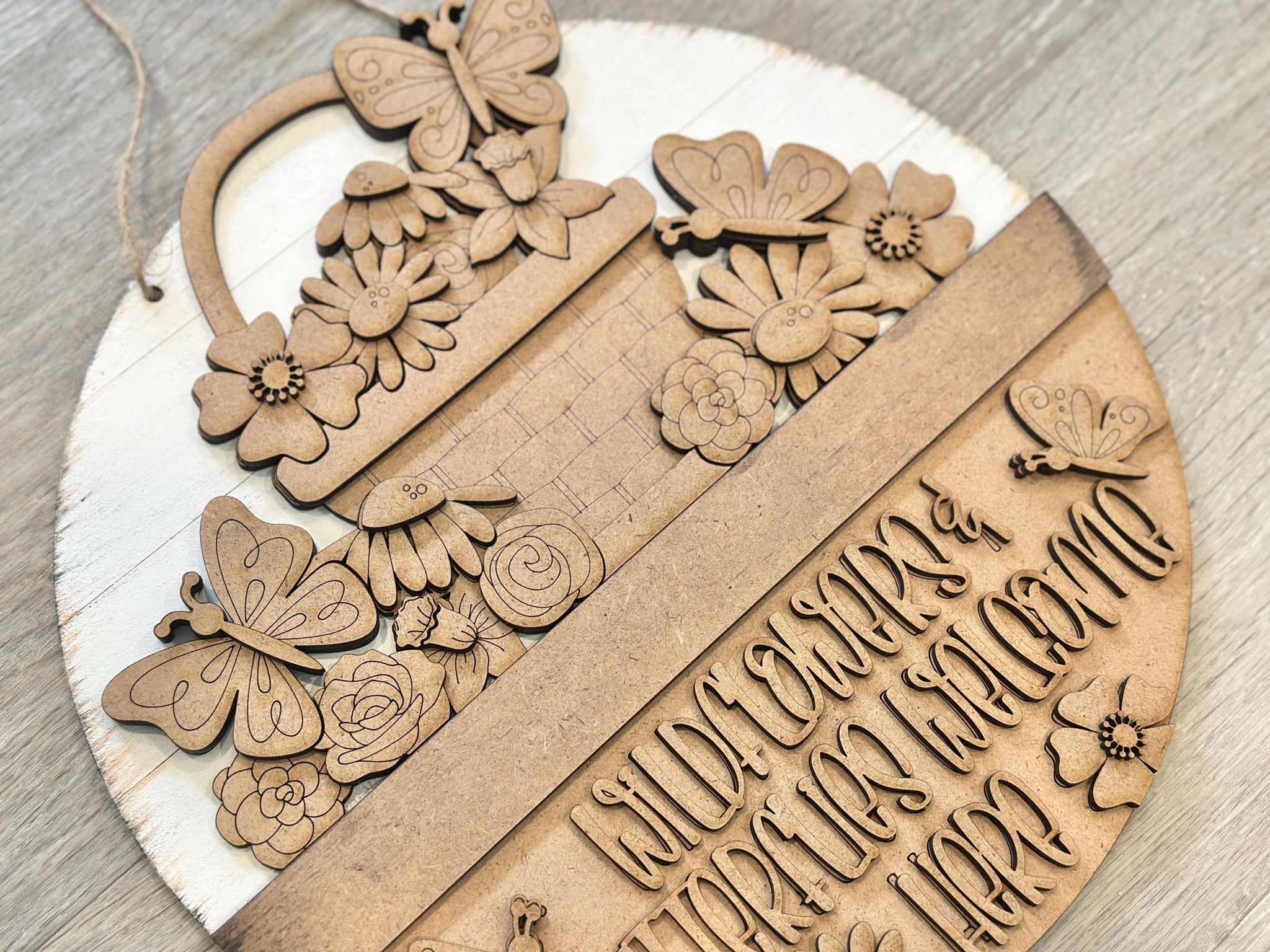 Flower Butterfly Holiday Door Sign Interchangeable File, SVG, Spring Basket Butterflies, Floral Tulip Daisy Seasonal Home Welcome, glowforge